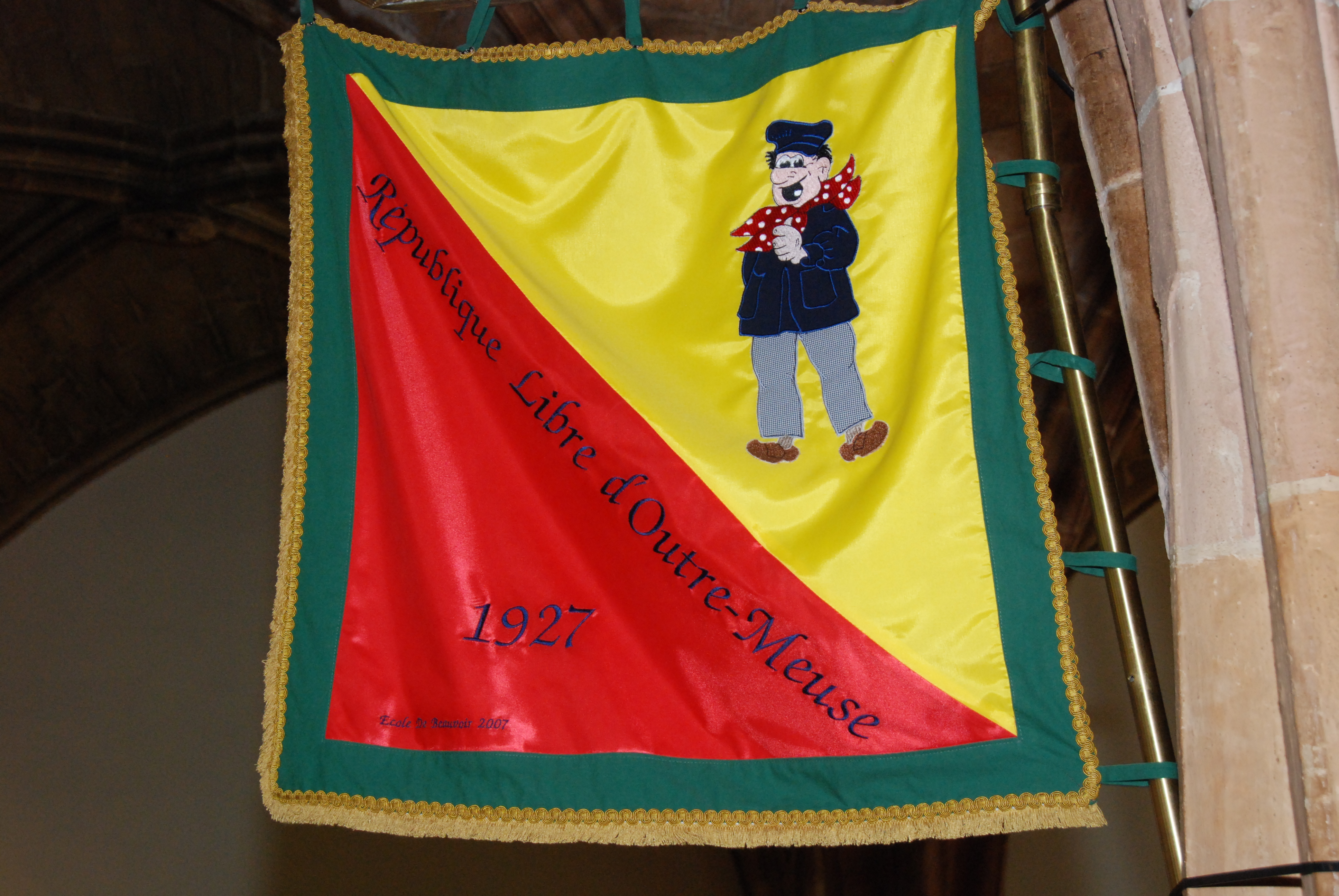 « TRADUCTION: » Je suis heureux d’être élu Maïeur de mon vieux quartier d’Outre-Meuse et je vous remercie de l’honneur que vous me faites. Aussi je vous promets qu’il n’y aura aucun bourgmestre comme moi sous le soleil et je n’abîmerai jamais, d’aucune manière, l’écharpe que vous me donnez. Tous les vieux usages et coutumes de mes aïeux seront respectés et si l’un et l’autre, comme je l’espère, me prête son coup d’épaule, dans notre République Libre d’Outre-Meuse, on ne fera pas des mouches à deux culs… Jamais plus, nous ne tirerons le diable par la queue, les taxes et toutes les sortes de contributions iront aux herbes pour la chèvre. Si nous voulons bien nous entendre et tirer à la même corde, nous monterons au ciel sans échelle. Vivat pour notre République. »